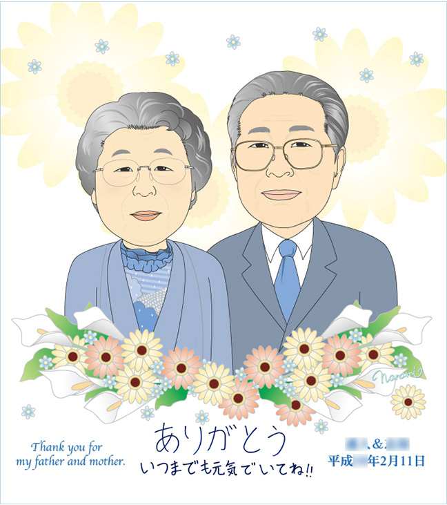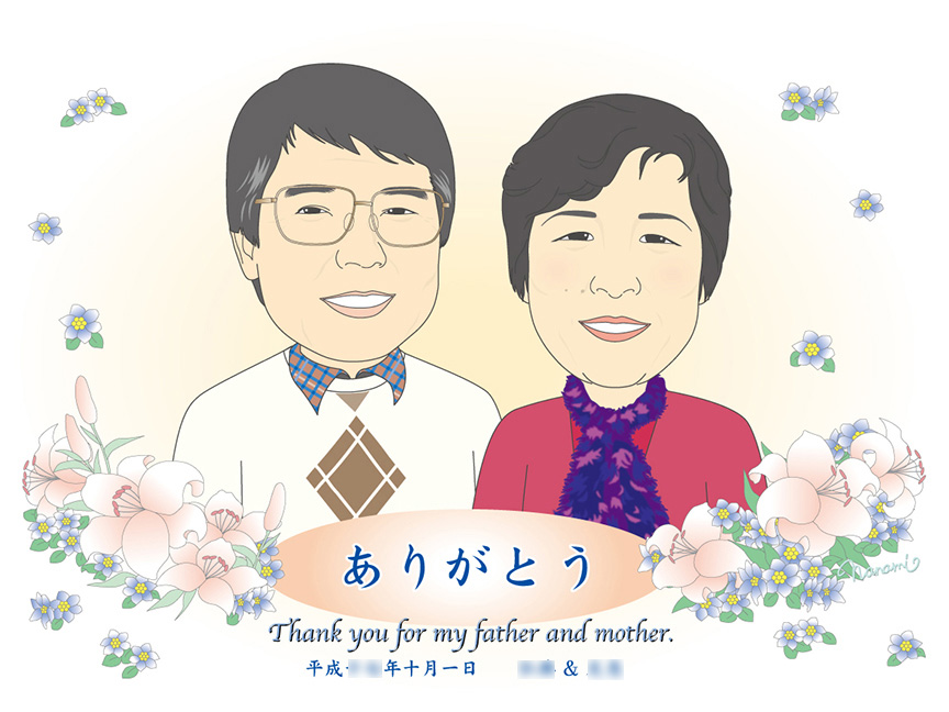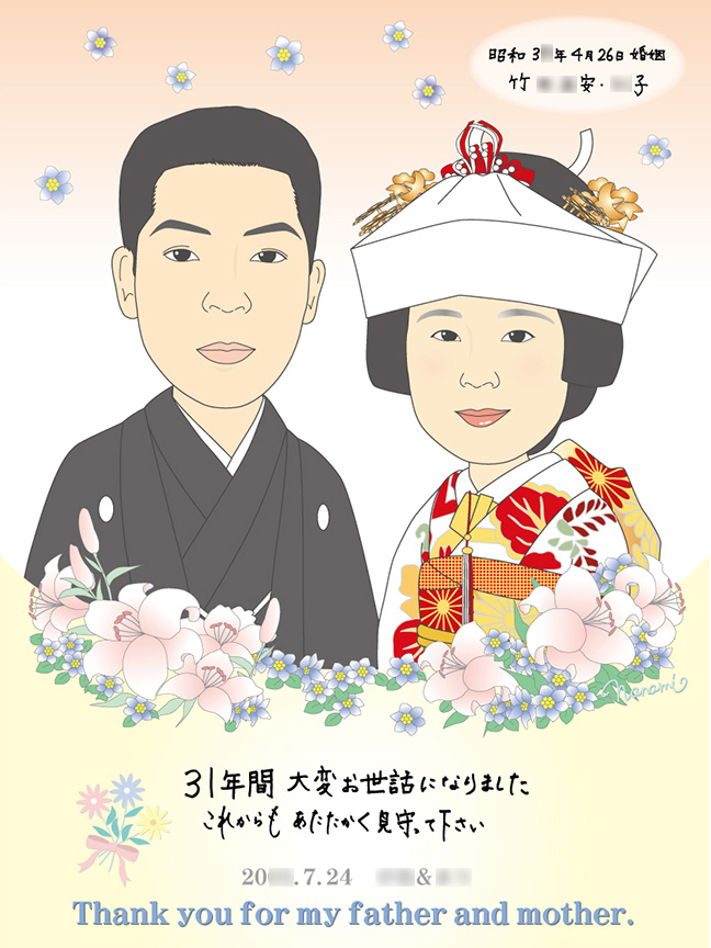両親の結婚式当時の似顔絵に新郎新婦の手書きメッセージ